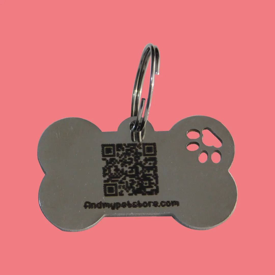 El clásico que nunca falla. Con forma de hueso y acabado en plata, esta placa combina estilo y funcionalidad. Su QR escaneable permite contacto inmediato con el dueño, brindando tranquilidad y seguridad a cualquier familia con peludos.